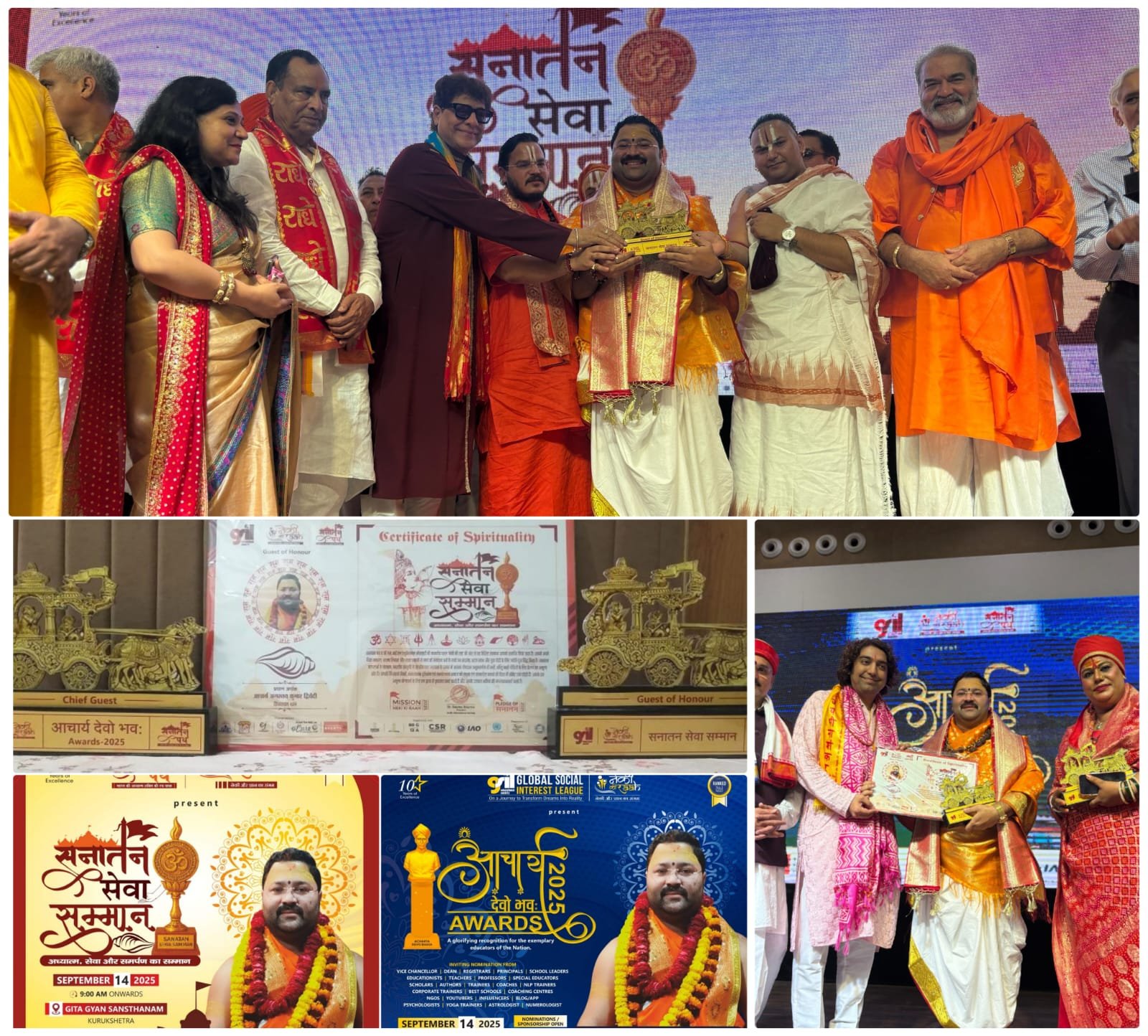 कुरुक्षेत्र में आचार्य देवो भव अवार्ड एवं सनातन सेवा सम्मान समारोह: आचार्य अगस्त्य कुमार द्विवेदी सम्मानित